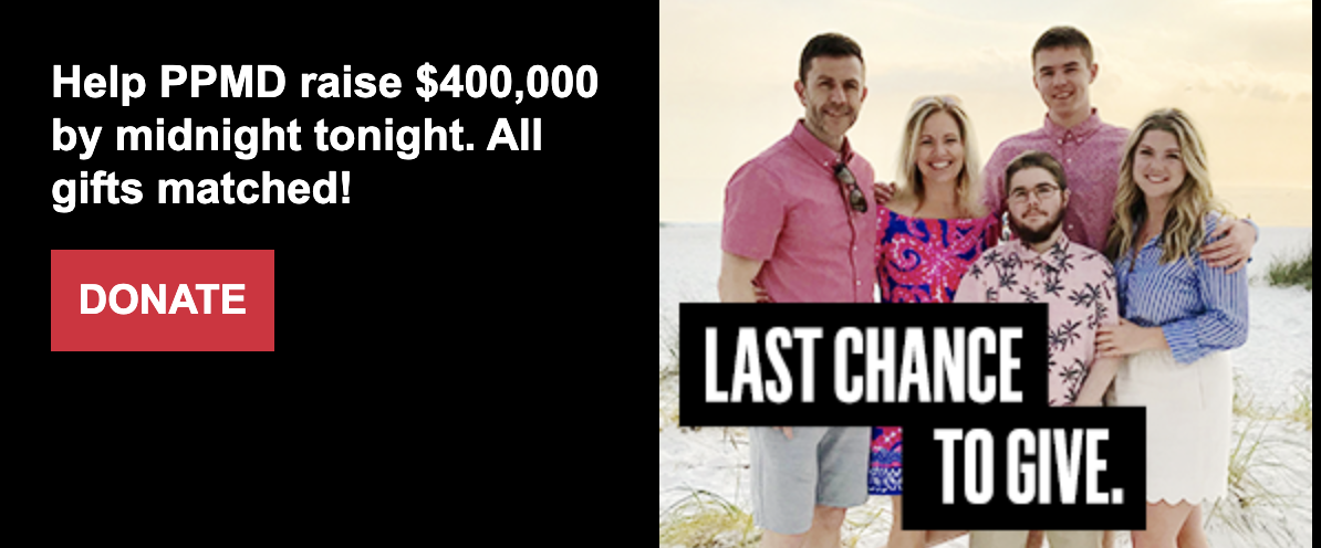 That’s why I am asking you today to join me in supporting PPMD’s Duchenne Protein Mapping Project, a critical next step in research. Understanding the progression of Duchenne is crucial to getting us where we need to go. With this information, we can unlock breakthroughs in research that will have a profound impact on the future of Duchenne research. Please make your gift before midnight and help us reach our goal of $400,000.