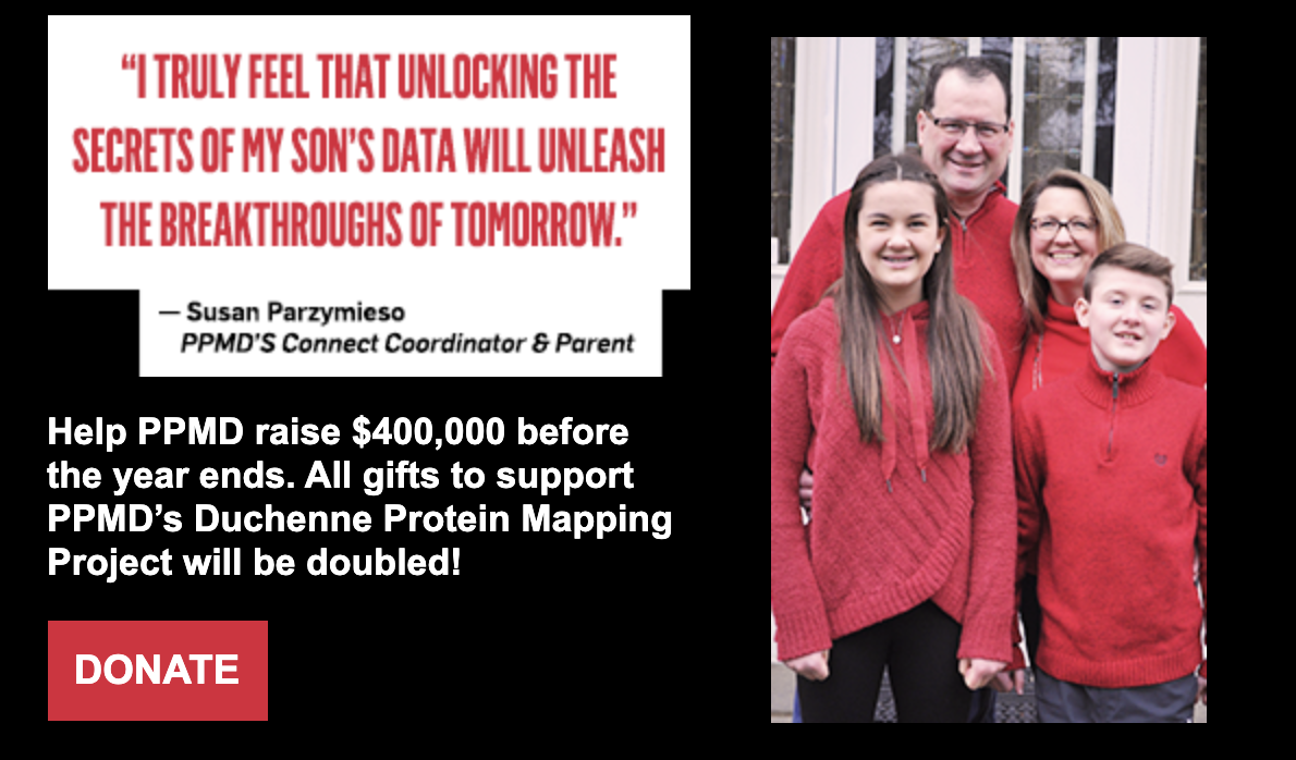 This year brought uncertainty for us all. Let’s embrace the certainty that data can bring to this community. Invest in PPMD’s Duchenne Protein Mapping Project and help us unleash breakthroughs that will get us closer to a world without Duchenne. Donate now so that we can reach our goal of $400,000.